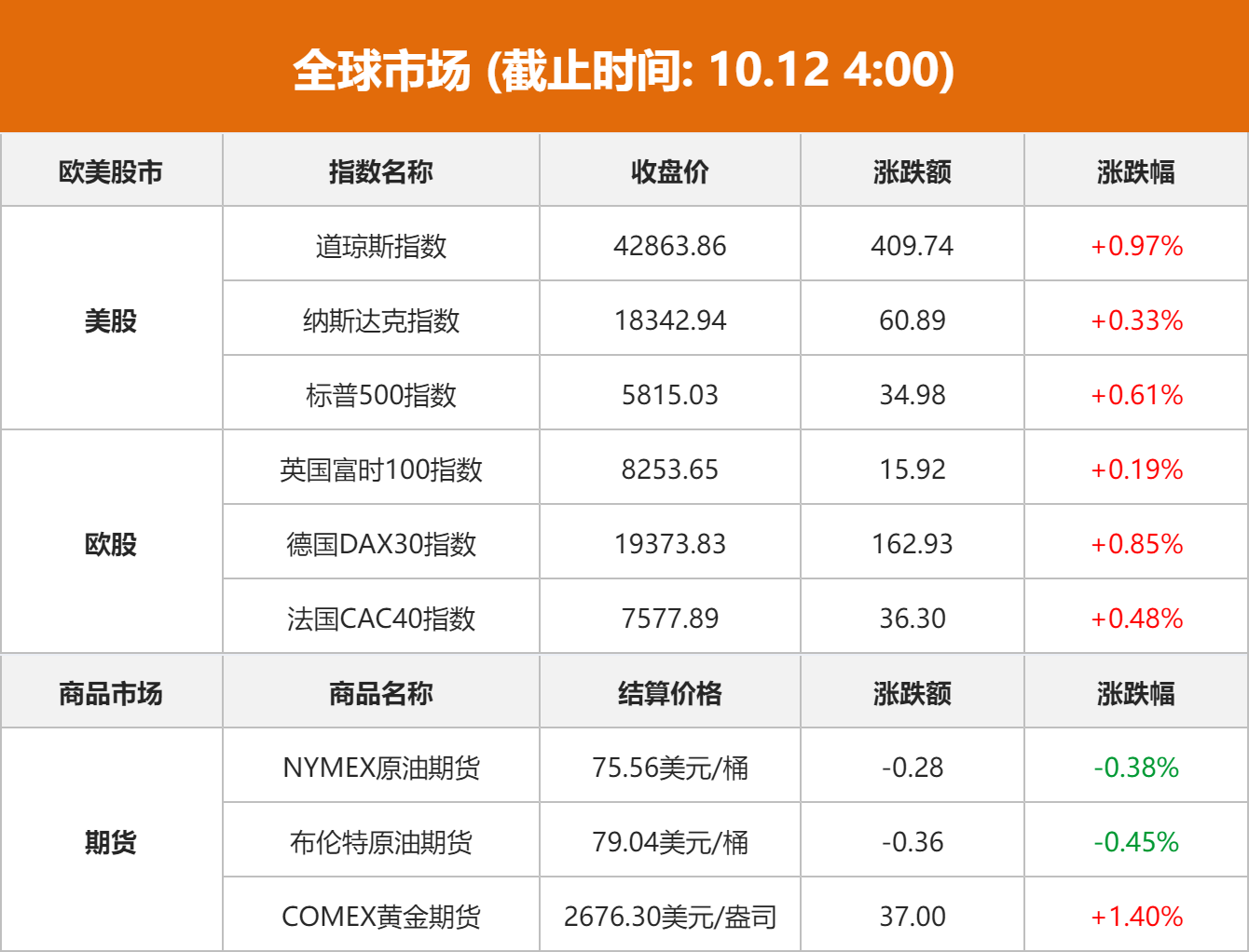 商品市场:国际油价下跌,纽约商品交易所11月交货的轻质原油期货价格下跌28美分,收于每桶75.56美元,跌幅为0.38%;12月交货的伦敦布伦特原油期货价格下跌36美分,收于每桶79.04美元,跌幅为0.45%。国际金价上涨,截至当天收盘,COMEX黄金期货主力合约上涨37美元/盎司,涨幅1.40%,报2676.30美元/盎司。