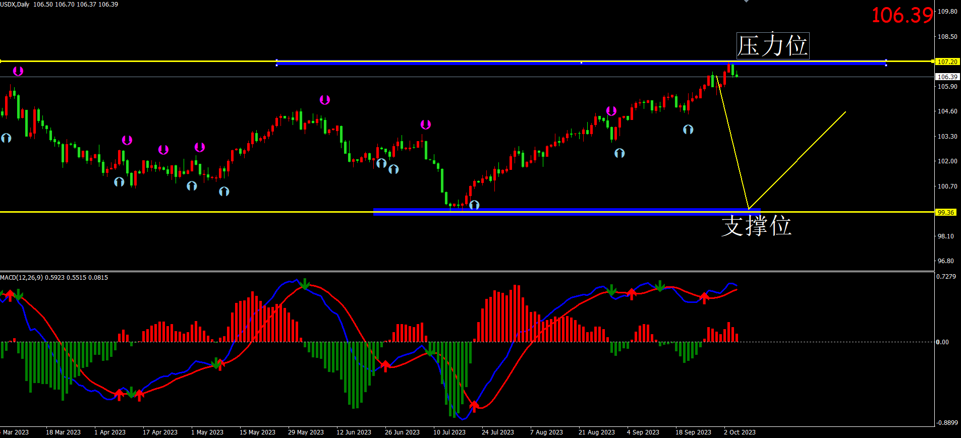 美元指数:图表显示美指为震荡反弹行情。关注压力107.00位置。